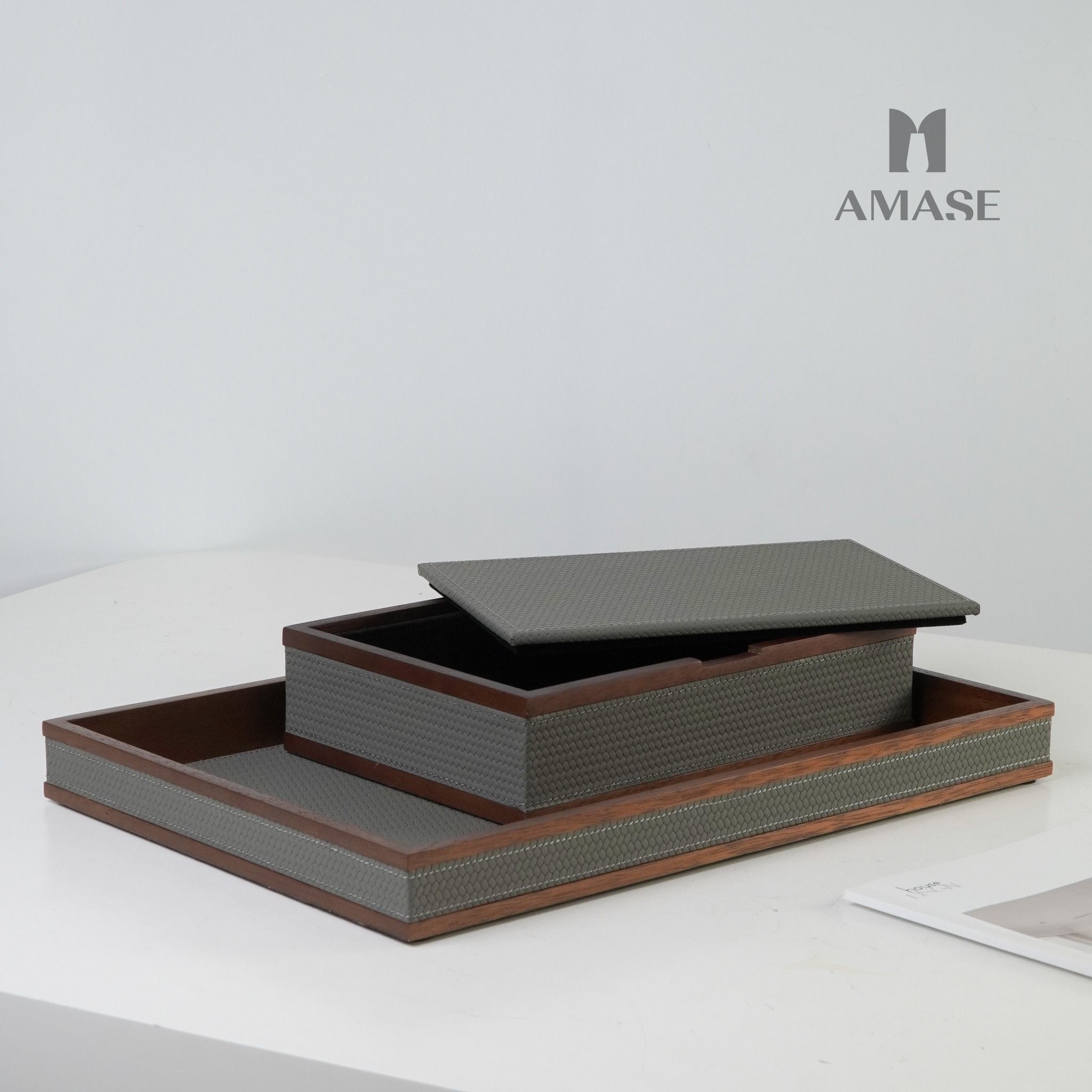 Hộp Trang Trí Viền Da Phối Gỗ Màu Xám