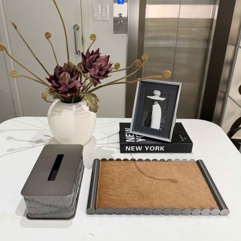 Khay Decor Lông ngựa Phối Viền ThépChất liệu:Viền thép phối lông ngựa Kích thước: 37.5 x 22 x 2.5 cm